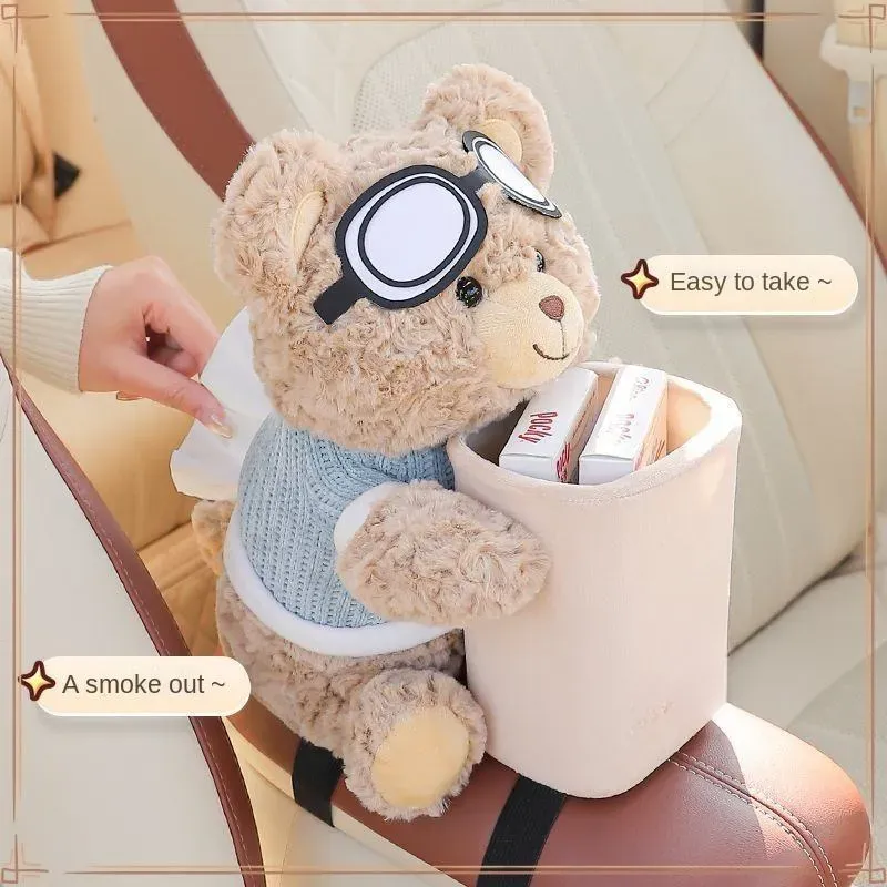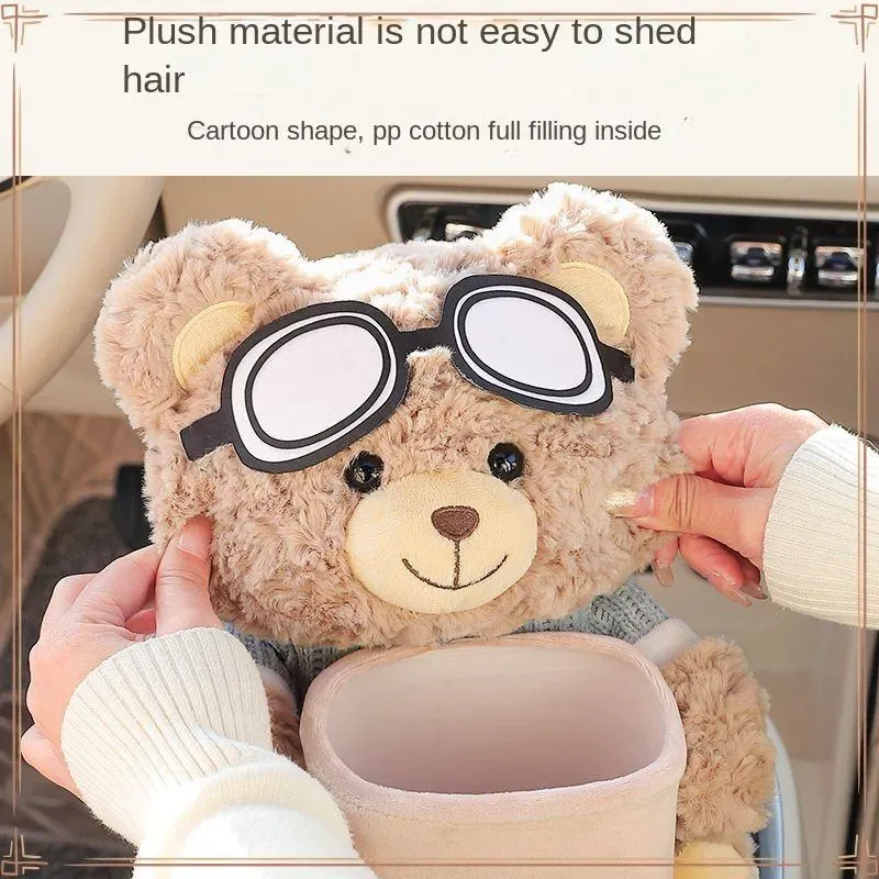 This car trash can, shaped like a bear, functions as a tissue box, a two-in-one storage bin, and a dishcloth container.